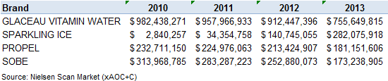 What’s most surprising about the success of Sparkling ICE is that many better-known products in the “enhanced water” category are struggling. Sales of vitaminwater, Propel, and SoBe have all been posting consistent declines — down 23%, 22%, and 45%, respectively, from 2010-2013.